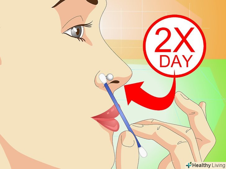 Ніколи не використовуйте для чищення сережки перекис водню або спирт. Очищайте Пірсинг тільки сольовим розчином, тоді місце пірсингу заживе швидко і без ускладнень. [5] якщо у вас нова стерильна Сережка для носа, немає необхідності очищати її сильним антисептичним засобом.- Перекис водню і спирт руйнують омертвілі клітини навколо місця пірсингу, що сприяє утрудненню процесу загоєння.
