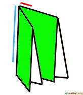 - одну ширину палітурки від кута уздовж краю з двома загинами, де з'єднуються два складених краю. Цей завмер показаний червоною лінією на попередній схемі.