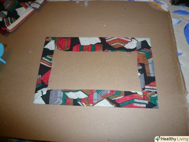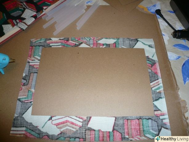 Покрийте два великих картонних прямокутника тканиною, приклеївши її краї до їх виворітного стороні. ви можете також приклеїти тканину до лицьової сторони, якщо хочете.