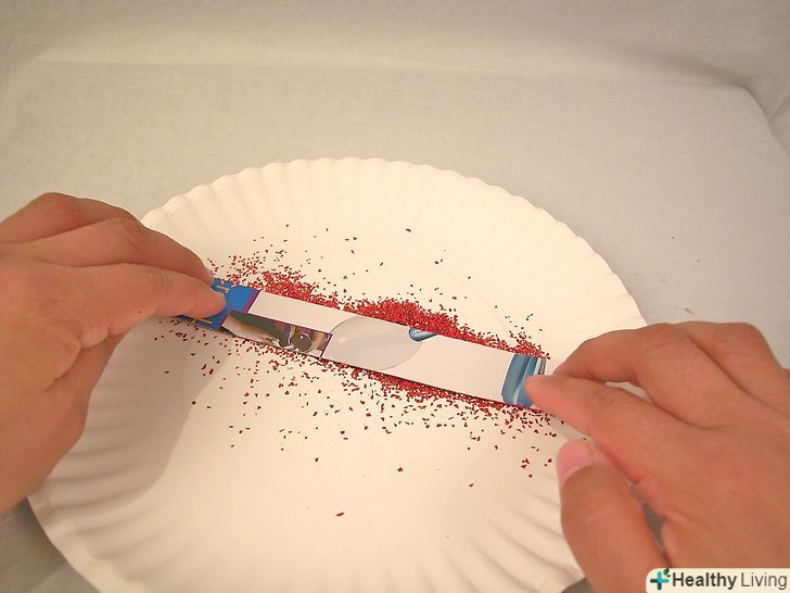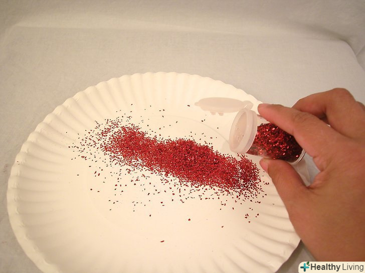 Покладіть картонну смужку в тарілку з блискітками пофарбованої стороною вниз. переконайтеся, що картонна смужка повністю покрита блискітками. Зачекайте, поки смужка з блискітками висохне. Це займе 5-20 хвилин.