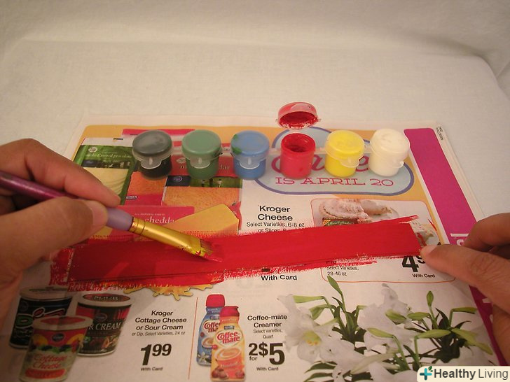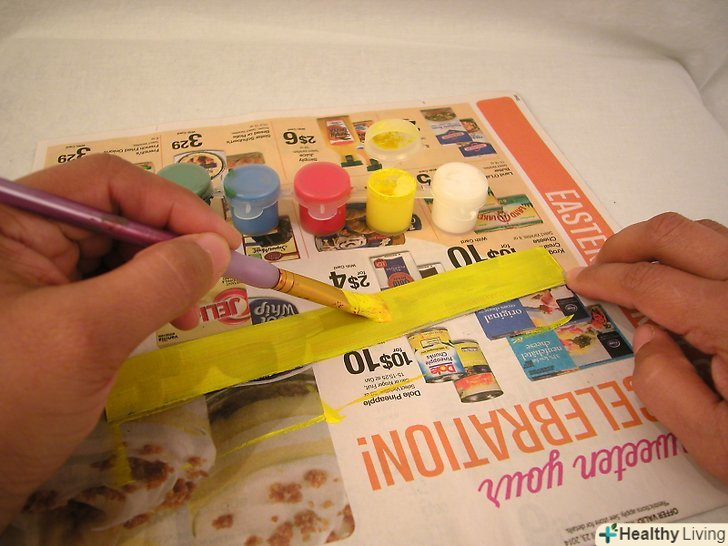 Покладіть смужку картону, обклеєну газетними смужками, на газету і покрийте її акриловою фарбою. зачекайте близько 10 хвилин — за цей час фарба повинна висохнути.