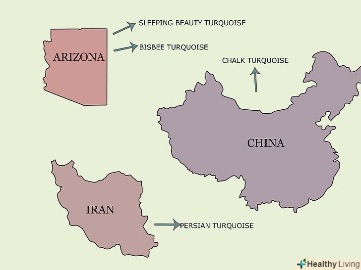 Навчіться визначати місце видобутку бірюзи. бірюзові шахти розташовані по всьому світу, і кожна шахта виробляє камені, які мають різні колір і маркування.- Спляча красуня - Бірюза, яка видобувається в Арізоні. Це твердий камінь (без матриць) має колір від королівського синього до небесно-блакитного.