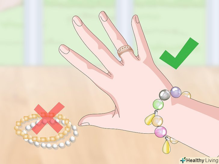 Носіть намиста і сережки замість кілець. вибирайте прикраси, які зношуються не так швидко, як кільця. Оскільки руки знаходяться в постійному русі, кільця піддаються впливу багатьох абразивних засобів для миття рук, лосьйонів і дезінфікуючих засобів. Сережки і намиста з меншою ймовірністю забарвлять шкіру, тому що вони менше піддаються впливу цих речовин.