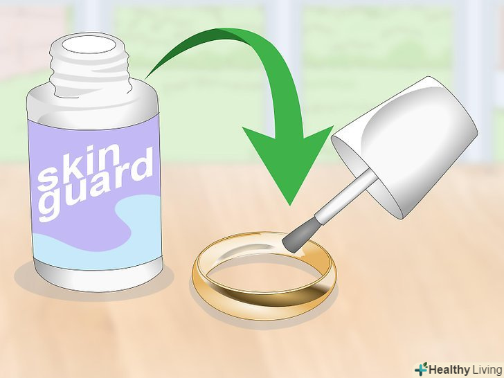 Використовуйте полімерний бар'єр між шкірою та кільцем. нанесіть на кільце захисний засіб відповідно до вказівок виробника. Ці засоби спеціально розроблені для обволікання металу і захисту шкіри від плям. [2]- Одного нанесення цього засобу вистачить приблизно на 2 місяці. Наносите засіб в міру необхідності, в залежності від того, як часто ви носите прикраси.