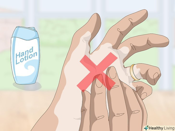 Не застосовуйте лосьйони, Парфуми та мило, якщо у вас є кільце. знімайте кільця, коли чепуритеся вранці і кожен раз, коли миєте руки. Кислоти в деяких миючих і косметичних засобах можуть викликати окислення кілець і прискорити їх руйнування. [4]