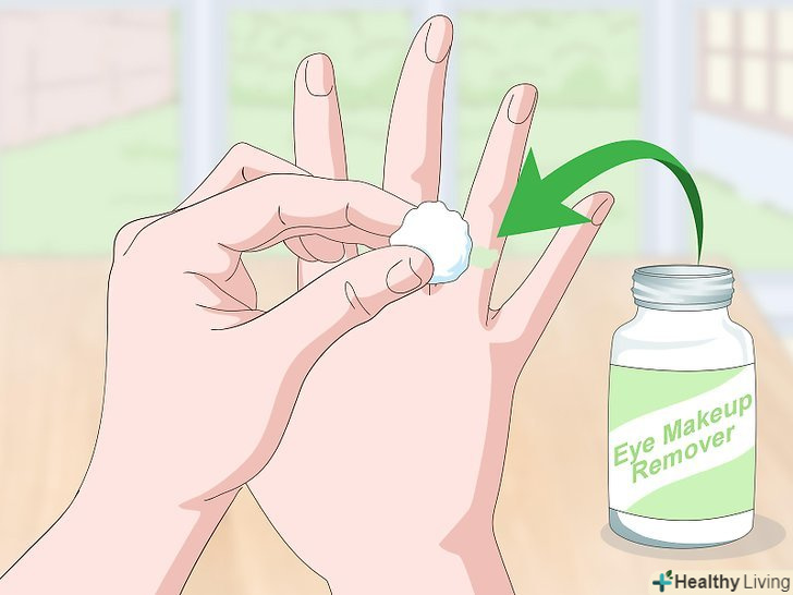 Спробуйте водостійкий засіб для зняття макіяжу з очей. змочіть ватяну кульку водостійким засобом для зняття макіяжу з очей, яке можна придбати в місцевому магазині косметики. Протріть ватним кулькою забарвлену ділянку пальця, приділяючи особливу увагу шкірі між пальцями, де може концентруватися фарбування.- Це дуже ніжний метод і він більше підходить для невеликих плям.