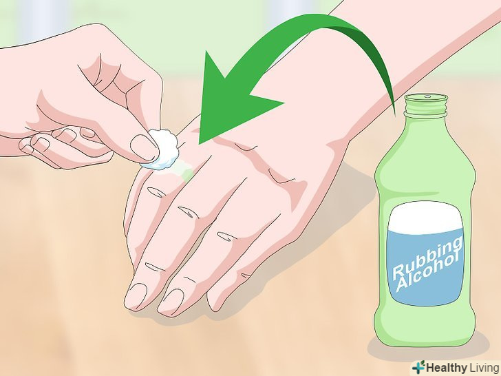 Використовуйте ватяну кульку з медичним спиртом. змочіть ватяну кульку медичним спиртом з місцевої аптеки. Розітріть забарвлену ділянку ватним кулькою, намагаючись уникати пошкодженої шкіри. Тоді як невелике почервоніння є нормальною реакцією на спирт, зупиніться, якщо відчуєте наростаючий свербіж.- Помийте руки водою з-під крана і милом після використання спирту.