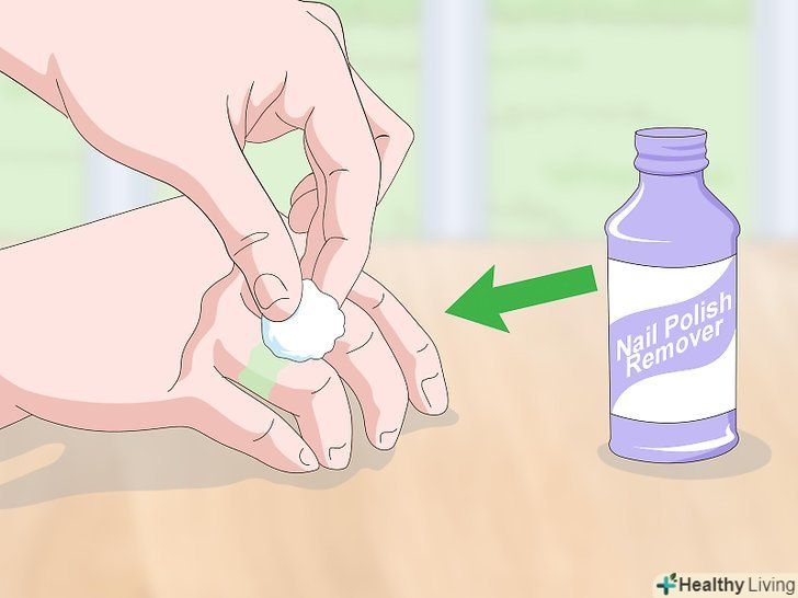 Використовуйте рідину для зняття лаку без ацетону. якщо фарбування досить серйозне, змочіть ватяну кульку засобом для зняття лаку без ацетону. Протріть пляму ватним кулькою, злегка натискаючи. Коли ви видалите пляму, ретельно вимийте руки з милом і водою і зволожите шкіру.- Не наносьте рідину для зняття лаку на пошкоджену або роздратовану шкіру.