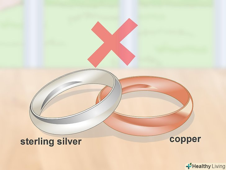 Уникайте міді, срібла та інших легованих сталей. запитайте, з чого зроблено кільце, перш ніж купити його. Кільця зі сплаву-що складається з декількох металів-а не з чистого металу, більш схильні залишати плями на пальцях. [5]- Найбільше окислення і фарбування в зелений колір схильні такі метали, як мідь і мідні сплави.