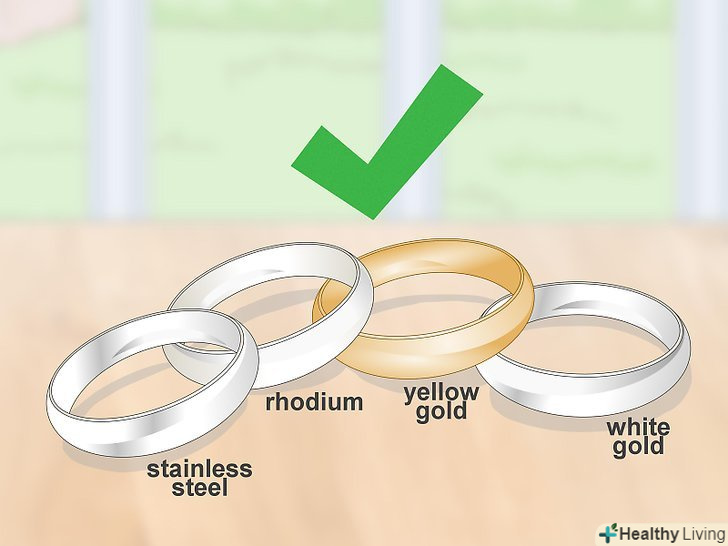 Виберіть кільця з нержавіючої сталі, родію, жовтого або білого золота. шукайте кільця з цих металів, так як вони менш схильні до окислення і розпаду. Вони також рідше викликають шкірну алергію і висип. [6]- Багато інтернет-магазинів спеціалізуються на ювелірних виробах для чутливої шкіри з цих металів.