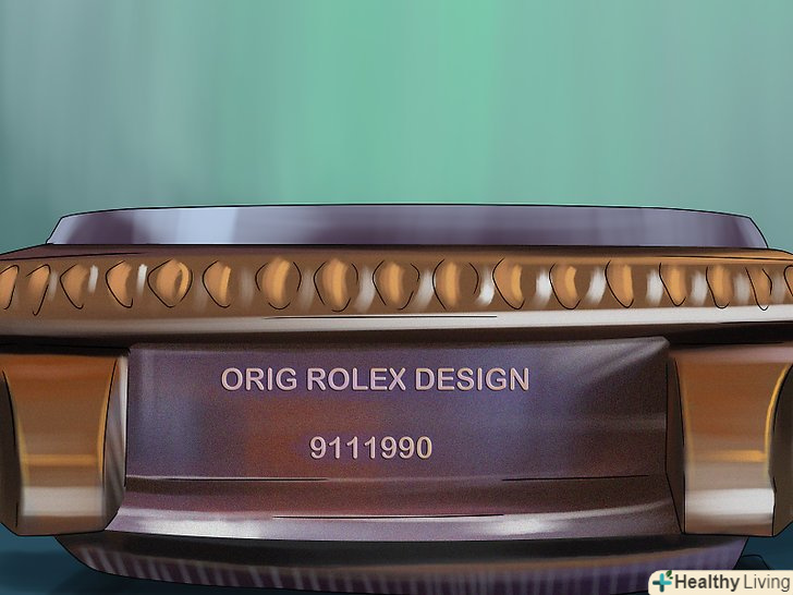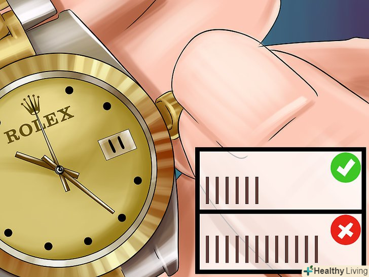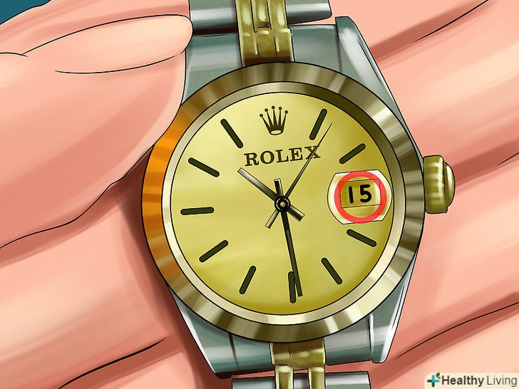 Збільшувальна лінза. у багатьох (але не всіх) [2] моделей Rolex є покажчик дати. Зазвичай він розташовується в правій частині циферблата (поруч з цифрою 3). Щоб краще було видно дату, виробник помістив над покажчиком дати невелике збільшувальне скло. Цю лінзу важко підробити, тому на багатьох фальшивих годинниках дане скло тільки виглядає збільшувальним, але якщо придивитися, то це звичайне скло. Якщо скло над покажчиком дати не збільшує цифру, то ви тримаєте в руках підробку.- Збільшувальна лінза на годиннику Rolex збільшує цифру в два рази, причому дата повністю поміщається в цю лінзу. [3] на деяких фальшивих годинниках теж є збільшує лінза, але виробники не можуть розрахувати розмір цифри і скла і цифра не завжди повністю займає лінзу.