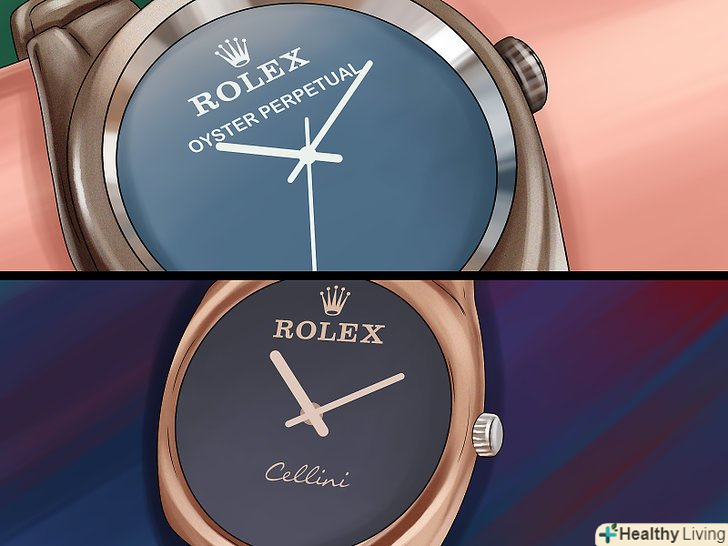 Написи на циферблаті. іншим відмітним знаком оригіналів є якісно зроблені написи, які рівно лежать навколо циферблата. Перевірте їх за допомогою збільшувального скла. Написи повинні бути чіткими, тонкими, без дефектів. Крім того, вони повинні бути вигравірувані на металевому циферблаті. Якщо схоже на те, що написи намальовані або надруковані — це підробка.- Таке гравіювання робили у серії годин Rolex під назвою Oyster. Годинники серії Cellini мають нестандартний дизайн (прямокутний циферблат і так далі), тому таке гравірування у них може бути відсутнім.