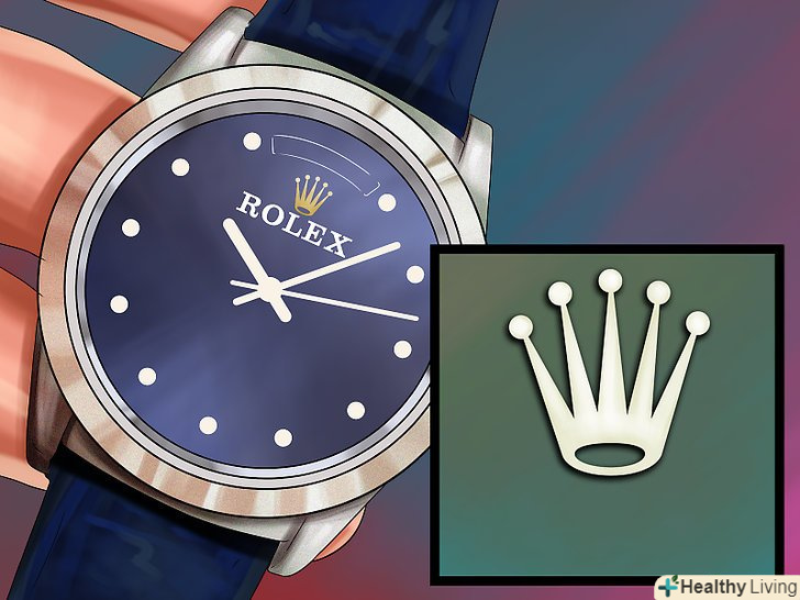 Зверніть увагу на якість логотипу на циферблаті. майже всі (але не всі) годинник Rolex мають на циферблаті фірмову емблему, яка розташовується поруч з цифрою 12. Оглянувши його під збільшувальним склом, ви також можете відрізнити підробку від оригіналу. Емблема виготовлена з високоякісного металу. Кола на краях корони опуклі. Блиск контуру корони повинен відрізнятися від інших частин корони. [10] якщо корона на вашому годиннику виглядає дешево і неякісно, то і сам годинник такої ж якості.