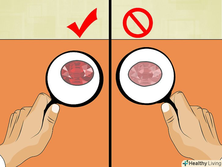 Оцініть колір і блиск каменю. справжні рубіни виблискують глибоким, яскраво-червоним кольором, майже як червоний колір світлофора. Підроблені камені часто бляклі, і нехай навіть вони виблискують, але не яскраво. Камінь темно-червоного кольору при найближчому вивченні може виявитися гранатом, а не рубіном. [2] глибина кольору справжнього Рубіна значно збільшує його вартість. [3]- Перевірте чистоту каменю. Підробки, як правило, містять вади і білі плями. До слова: іноді навіть справжні рубіни містять дефекти.