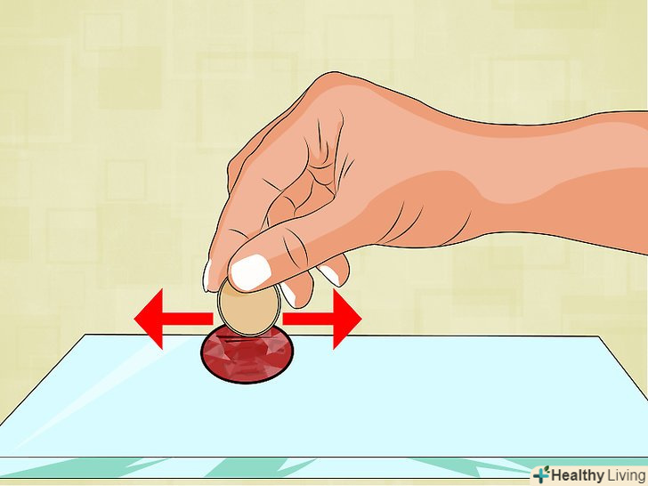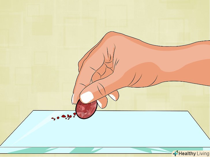 Перевірте, чи дряпається рубін об іншу поверхню. акуратно подряпайте рубін об тверду рівну поверхню, таку як кераміка або скло. Камінь повинен подряпати поверхню, в іншому випадку це не справжній рубін. Однак слід діяти обережно, так як рубін може залишити відмітини червоного кольору на поверхні, яку ви намагалися подряпати. [9]- Червона подряпина може бути ознакою того, що камінь штучно підфарбований. Це говорить про те, що «дорогоцінний камінь» насправді складається з набагато більш м'якого матеріалу.