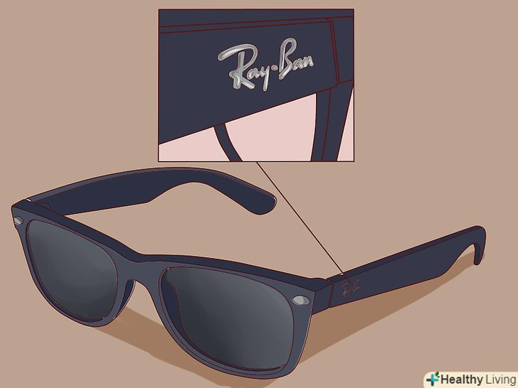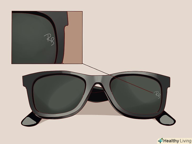 Перевірте, чи рівно розташований логотип на дужці очок. зніміть окуляри і подивіться на них збоку. Рукописний логотип "Ray-Ban" повинен бути на дужці окулярів. Уважно його розгляньте-він повинен бути чітким, професійно виконаним, більш-менш вирівняним по «дужках» очок. Якщо сам по собі логотип здається неякісним, або прикріпленим на одній зі сторін окулярів клеєм або штифтом, то ваші окуляри, швидше за все не є оригіналом.- Очевидно, що на моделях Ray-Ban з дуже тонкими "дужками", наприклад як у Aviators, логотипу немає.