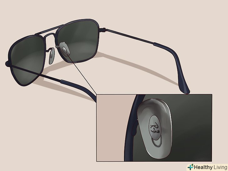 Подивіться, чи немає низькоякісних гравіювань в куточках лінз. Погляньте на передню частину своїх очок. Якщо ви носите такі моделі як Wayfarer або Clubmasters, то в куточку лінз ви повинні побачити маленьку, срібну, плоску у формі ромбика або у формі овалу позначку. Вона повинна бути чіткою, блискучою і майстерно виконаної. У вас не повинно вийти відскребти цей блискучий матеріал, а сама мітка не повинна виглядати так, ніби її легко видалити. Якщо гравірування виглядає кустарно виконаної, то, швидше за все, ваші окуляри є підробкою.