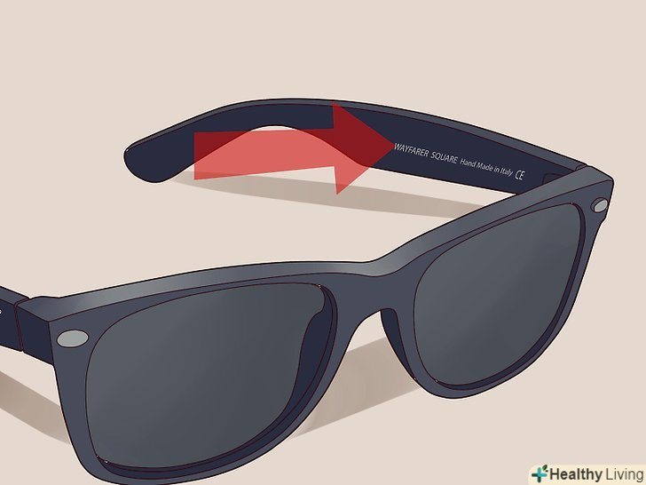Пошукайте номер моделі на внутрішній стороні» дужки " очок. Погляньте на ту внутрішню частину» дужок " окулярів, яка прилягає до ваших вух. Якщо у вас модель Wayfarer або Clubmasters, то ви повинні розгледіти на дужці білий текст. На лівій дужці очок ви повинні побачити серійний номер і код виробника. На правій дужці ви повинні побачити логотип Ray-Ban, напис "Made in Italy «і стилізоване» CE" (знак того, що ці окуляри мають сертифікат для продажу в Європі). Якщо цього тексту немає, або він змазаний, або погано віддрукований, то практично 100% ймовірності того, що ваші окуляри підроблені.- Якщо у вас все ще залишилася оригінальна упаковка від Ray-Ban, перевірте серійні номери на окулярах і на одній з етикеток на коробці на предмет збігу. Якщо вони не збігаються, то це явна ознака обману.