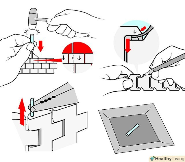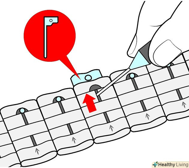 Виберіть, який сегмент ви збираєтеся видалити. використовуйте знімач пружин або витончене шило, щоб видавити стрижень, що скріплює певну ланку, слідуючи напрямку надрукованих стрілок в нижній частині ланки. [3]- Необхідно видавити стрижень на 2-3 мм, а потім дістати його за допомогою плоскогубців або вручну.