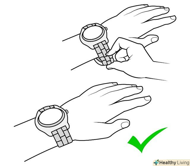 Виміряйте довжину браслета. перед укороченням браслета виміряйте його довжину, щоб точно знати, скільки ланок вам знадобиться видалити. Щоб зробити це:- Одягніть годинник на зап'ясті так, як ви будете їх носити. [1] Коли ви будете задоволені їх розміщенням, поверніть зап'ястя, щоб застібка браслета дивилася вгору.