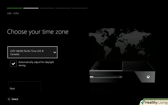 Вкажіть свій часовий пояс.після перезапуску Xbox One, вас попросять натиснути на геймпаді кнопку Home, щоб продовжити настройку. Спочатку вкажіть свій часовий пояс. І знову, вибір за замовчуванням буде залежати від зазначеної вами раніше країни.