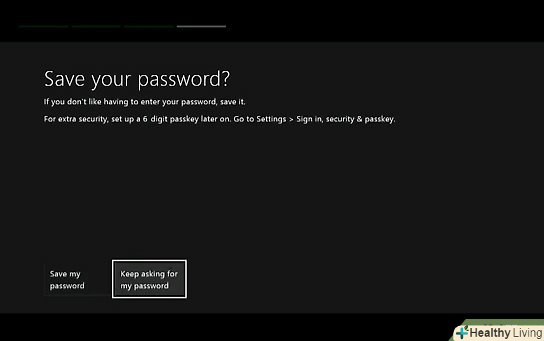 Збережіть пароль.перш, ніж вийти з налаштування, Xbox One запитає у вас, чи хочете ви зберегти пароль. Рекомендується зробити це, щоб консоль не запитувала пароль при кожному вашому вході, але якщо ви стурбовані тим, хто може використовувати вашу консоль, тоді не охороняйте пароль.- Вас також запитають, чи хочете ви, щоб ви входили автоматично після розпізнавання Вас сенсором Kinect.