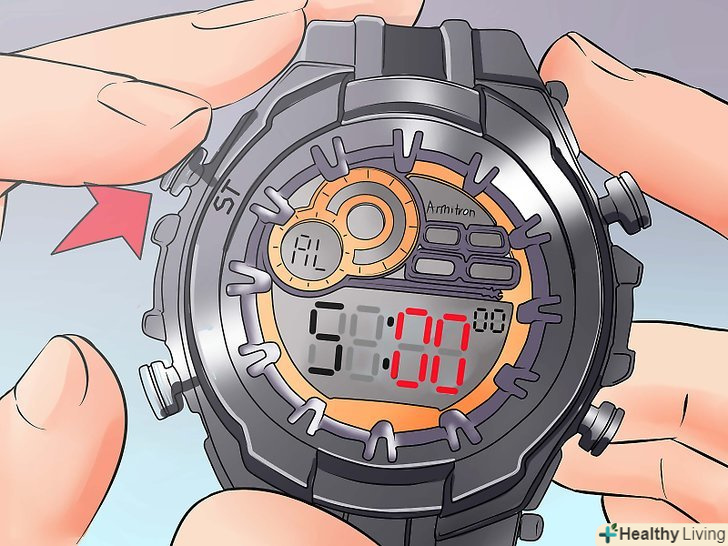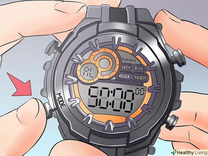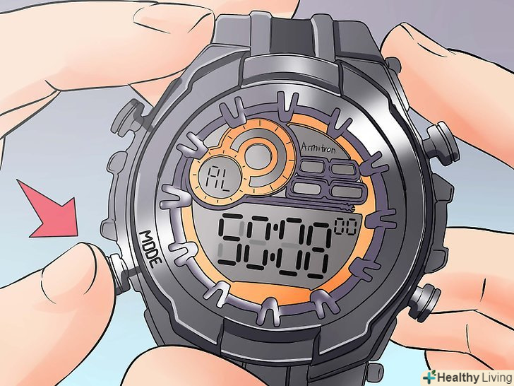 Утримуйте кнопку "MODE". Натисніть і утримуйте протягом двох-трьох секунд кнопку з написом "MODE" або ж поки секунди не почнуть блимати.- Враховуйте, що можуть існувати відмінності між різними цифровими моделями. У той час як ці інструкції застосовні для більшості цифрових моделей «Armitron», проте назви на кнопках і порядок дій для деяких моделей можуть трохи відрізнятися.