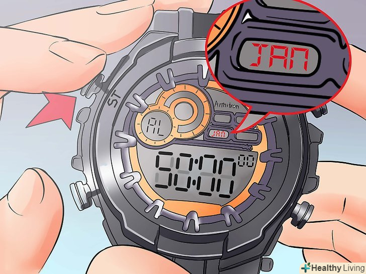 Встановіть місяць. Натисніть і відпустіть «ST / STOP"; повинна відобразитися дата і автоматично почне блимати індикатор Місяця. Натисніть кнопку "ADJUST", щоб встановити правильний місяць.- У деяких моделях індикатор дати починає блимати раніше індикатора Місяця. Встановіть дату за таким же принципом (натискаючи кнопку "ADJUST"»