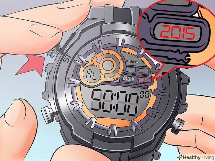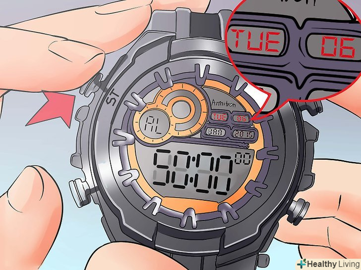 Змініть дату. натискайте і відпускайте» ST/STOP", поки не почне блимати дата. Встановіть дату, натискаючи кнопку "ADJUST".- Натисніть кнопку «ST/STOP», якщо спочатку блимає дата, після чого ви зможете змінювати установки індикатора Місяця. Змініть місяць, натиснувши кнопку "ADJUST".