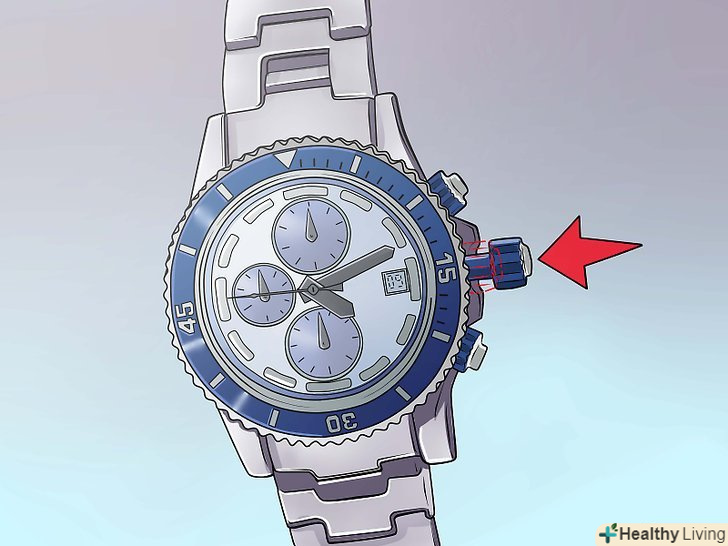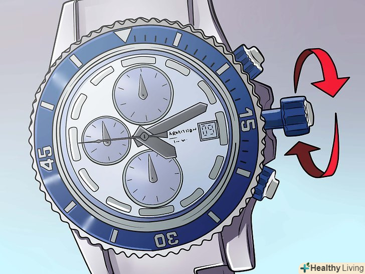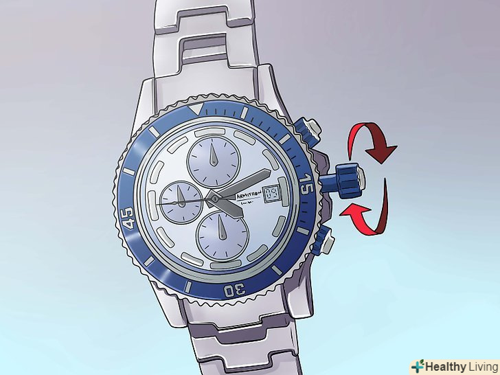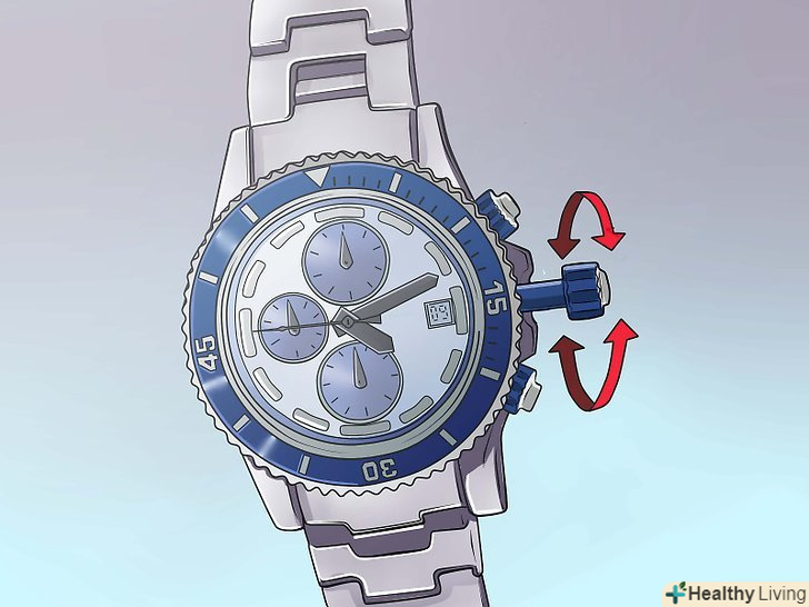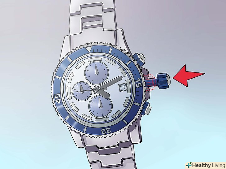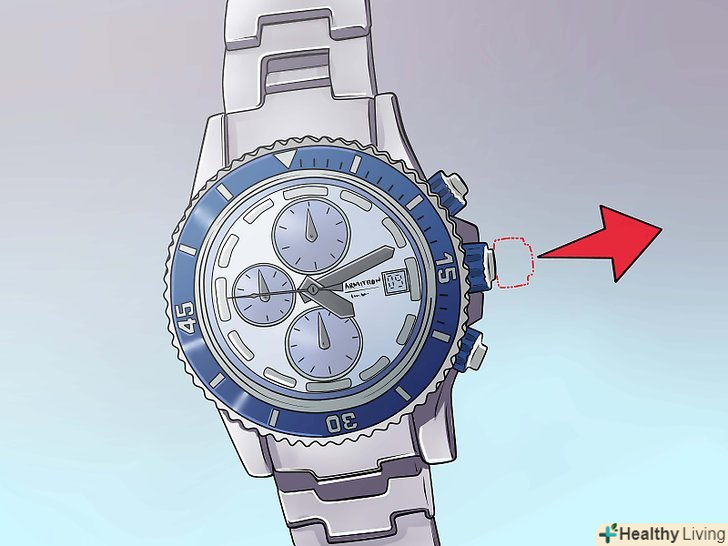 Потягніть за головку заводного механізму. витягніть головку заводного механізму до самого кінця. Всі стрілки на циферблаті повинні зупинитися.- Якщо ви власник стандартної аналогової моделі, яка показує тільки час, вам буде потрібно висунути головку на один клацання.