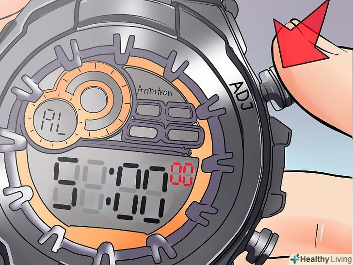Обнуліть секунди. Натисніть і утримуйте кнопку, на якій написано " ADJUST» і скиньте секунди до нуля.- Якщо на годиннику в даний момент відображено 30 або більше секунд, при обнуленні секунди автоматично додають ще одну хвилину до поточного часу на годиннику.