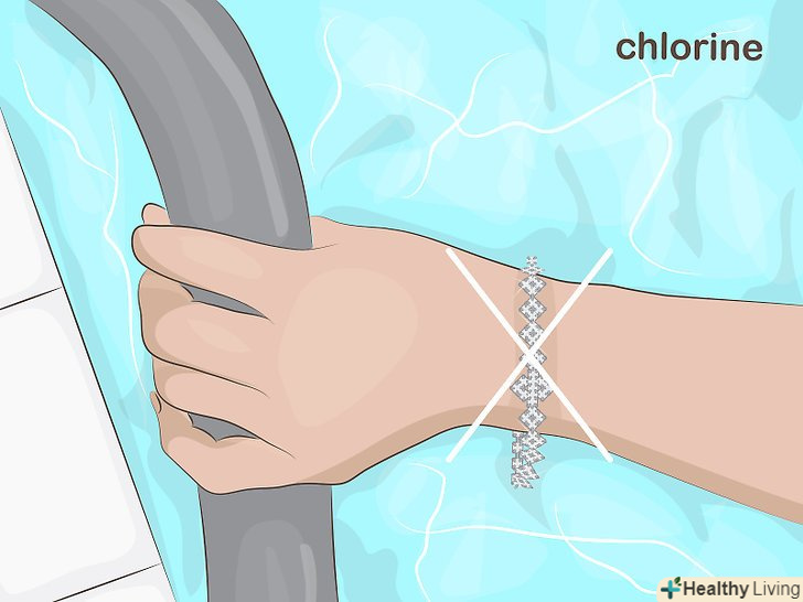 Знімайте прикраси з білого золота перед плаванням в хлорованій воді. Хлор роз'їдає родієве покриття. Тому не надягайте прикраси з білого золота в басейн. [12]- Якщо ви відвідуєте громадський басейн, здавайте цінності в камеру зберігання, або залишайте їх в бардачку машини або ж для безпеки ховайте глибше в своїй спортивній сумці.