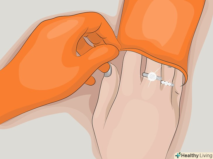 Одягайте рукавички, коли збираєтеся користуватися абразивними миючими засобами. хімікати роз'їдають покриття прикрас, крім того, вони можуть проникати всередину кріплень і викликати їх руйнування, через що інкрустовані камені з плином часу можуть розхитатися. [13]- Якщо ви не хочете користуватися рукавичками, просто не забувайте знімати прикраси з білого золота, перш ніж працювати з миючими речовинами.