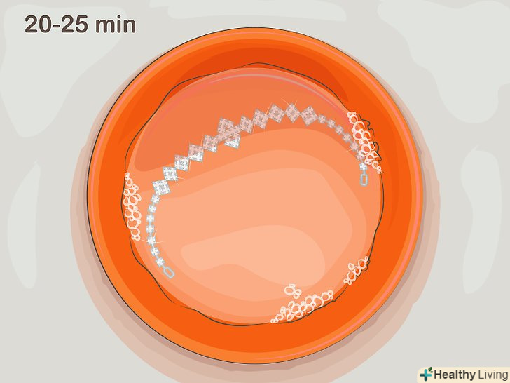 Залиште прикраса відмокати в розчині на 20-25 хвилин. це зовсім нескладно! Просто акуратно занурте виріб у воду, налаштуйте таймер і займіться іншими справами. [3]- Приготуйте пасту з харчової соди і води, щоб почистити прикраса. візьміть невелику миску, насипте в неї половину столової ложки харчової соди (близько 10 г) і додайте рівно стільки води, скільки буде достатньо для утворення густої пасти. Вийміть прикраса з мильного розчину і потріть кожен його елемент м'якою щіткою (наприклад, зубної) з приготовленою пастою. [5]