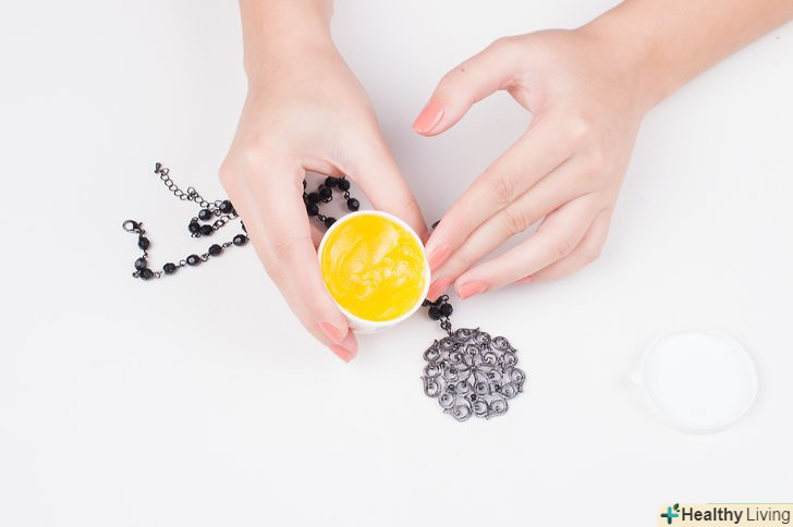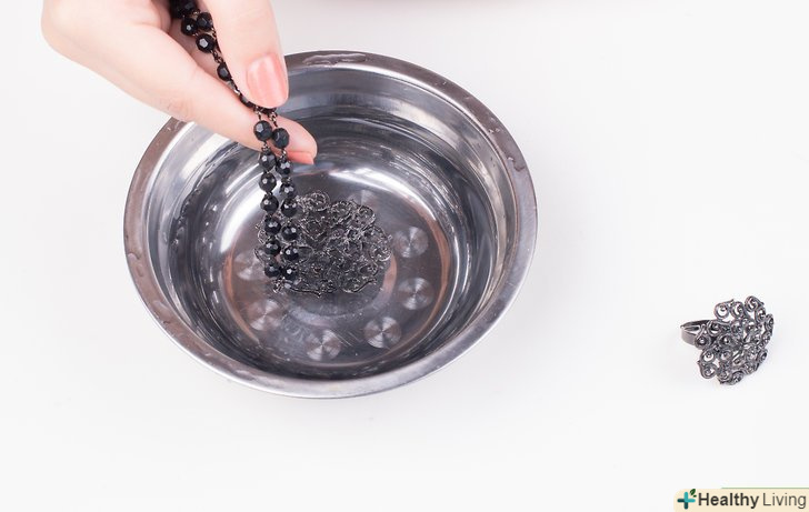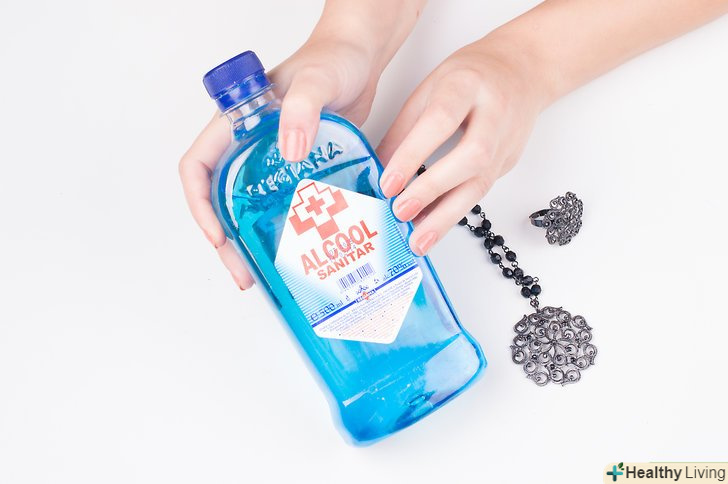 Купіть пляшку медичного спирту в аптеці або магазині. потім візьміть невелику ємність і налийте в неї спирт. Замочіть в імпровізованій ванні біжутерію на півгодини.- Потім дістаньте біжутерію і витріть надлишки спирту. Дозвольте висохнути протягом 15 хвилин.