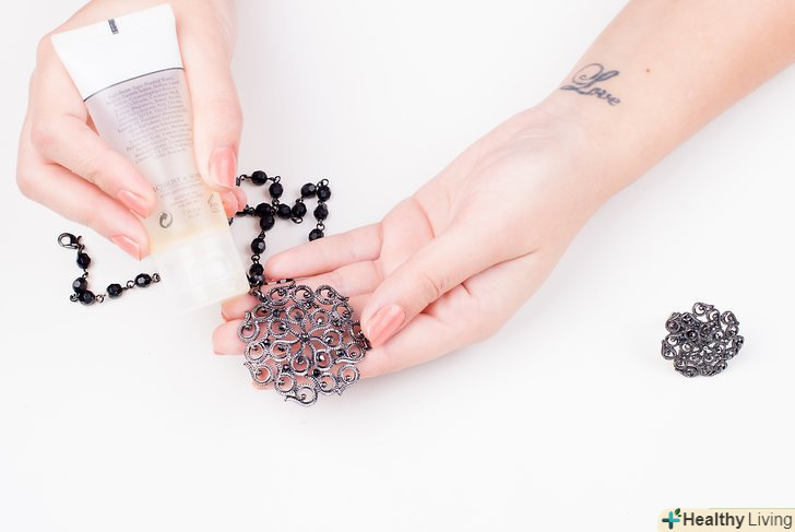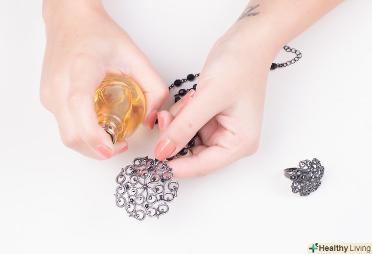 Наносите парфуми, лак для волосся і лосьйон до того, як надіти біжутерію. Так як засоби на водній основі, навіть якщо це духи і лосьйони, можуть викликати потемніння прикрас. [12]- Роблячи подібним чином, ви зменшуєте шанс потрапляння духів або лосьйонів на прикраси. Зачекайте, поки ваша шкіра не висохне. Тепер можете надягати біжутерію.