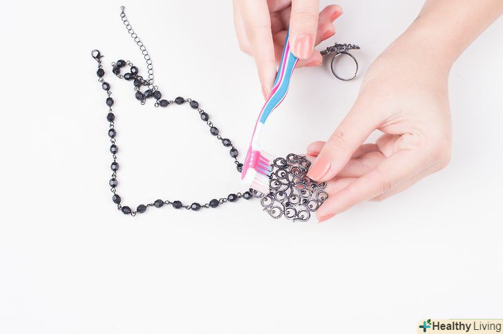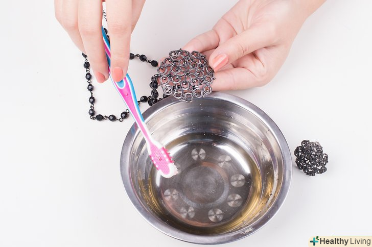 Спробуйте використовувати розчин білого оцту і води. замочіть прикраси в цій рідині, а потім використовуйте м'яку зубну щітку, щоб очистити прикраси у важкодоступних місцях. [8]- Чистка прикрас в суміші оцту і води додасть їм блиск. М'яка зубна щітка допоможе вичистити забруднення з тріщин каменів, якщо такі мають місце бути. Ви можете просто нанести оцет на губку і використовувати для чищення біжутерії.