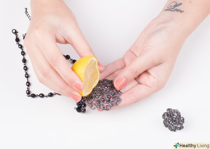 Спробуйте використовувати лимон для очищення шкіри. вже багато років люди використовують лимон для очищення прикрас від оксидного шару, який утворюється на поверхні металу з плином часу. Для кращого ефекту ви можете змішати невелику кількість соди з лимоном. [6]- Лимон є природним окислювачем, тому натирання прикрас половинкою розрізаного лимона зможе прискорити процес очищення. Ви можете опустити прикраси в склянку з сумішшю солі і лимона на ніч. Лимон особливо добре очищає срібло. [7]