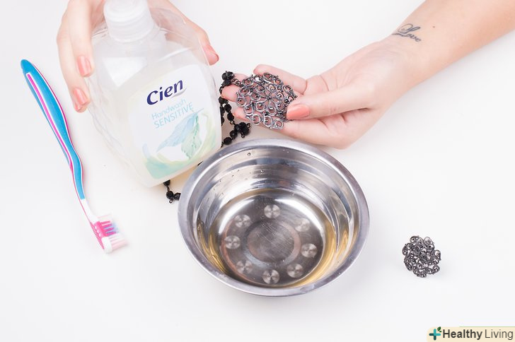Спробуйте використовувати мило для рук і теплу воду. це не тільки поліпшить зовнішній вигляд прикрас, але і додасть приємний запах. Нанесіть трохи води на прикраси, хоча при цьому необхідно обмежувати її кількість, так як при тривалому впливі вода може спровокувати появу іржі.- Використовуйте рушник для м'якого очищення прикрас. Вимочування біжутерії в воді тривалий час є не найкращою ідеєю, так як це може зіпсувати їх зовнішній вигляд і обробку. Такий підхід буде працювати набагато краще на ювелірних виробах з дорогоцінними каменями.