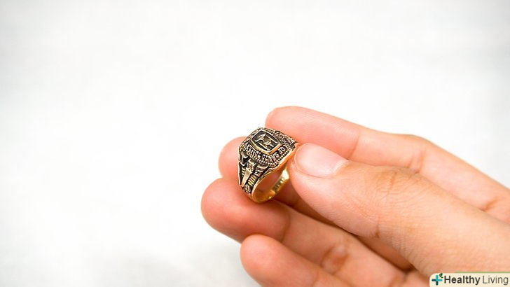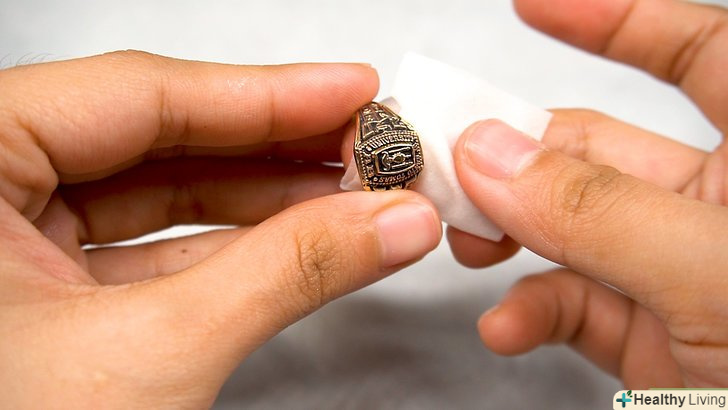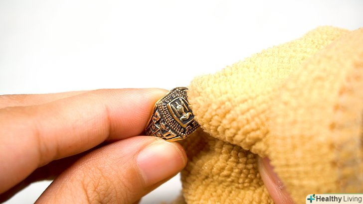 Акуратно почистіть кільце, враховуючи особливості матеріалу, з якого воно зроблено. кожен метал по-своєму реагує на різні хімічні речовини. Тому важливо поводитися акуратно з кожним видом металу, щоб він служив довше.- Чистіть золото м'якою ганчіркою і спеціальним засобом для очищення золота. Не використовуйте мило і засоби, що містять хлор. [1]