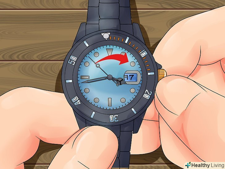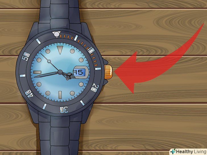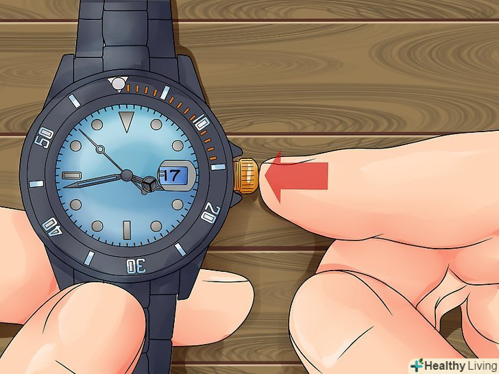 Переконайтеся, що заводна головка знаходиться в першому положенні. для цього злегка натисніть на неї, щоб переконатися, що вона не витягнута. Якщо у вас водонепроникний годинник, обов'язково переконайтеся, що головка закручена до упору. Для цього візьміть головку вказівним і великим пальцями і закрутіть головку, натискаючи на неї.