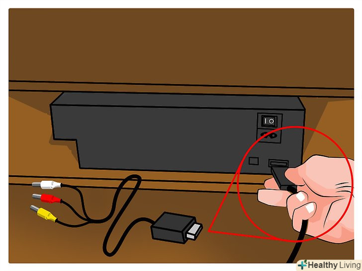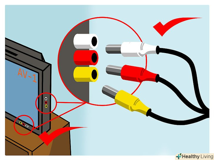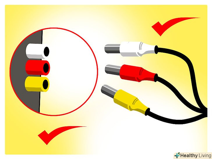 - Аудіороз'єм (червоний і білий) може розташовуватися далеко від відеороз'єму. Якщо ваш телевізор підтримує тільки монозвук, просто використовуйте білий штекер аудіо кабелю.[2]