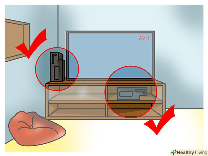 Поставте PlayStation 2 поруч з телевізором або ресивером.- Переконайтеся, що навколо приставки багато вільного простору; в іншому випадку приставка буде перегріватися. Не ставте приставку на інший електронний пристрій і не ставте інший пристрій на приставку. Поставте приставку вертикально, щоб вона займала менше місця. Розташуйте приставку досить близько до телевізора, щоб кабелі не були натягнуті.[1]