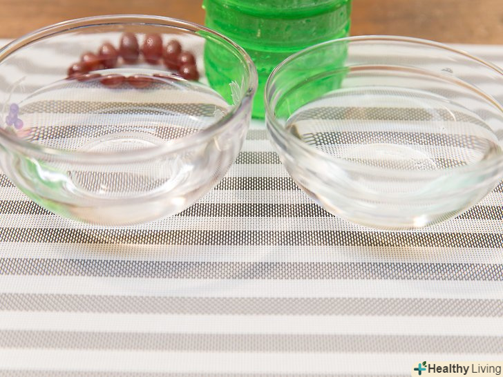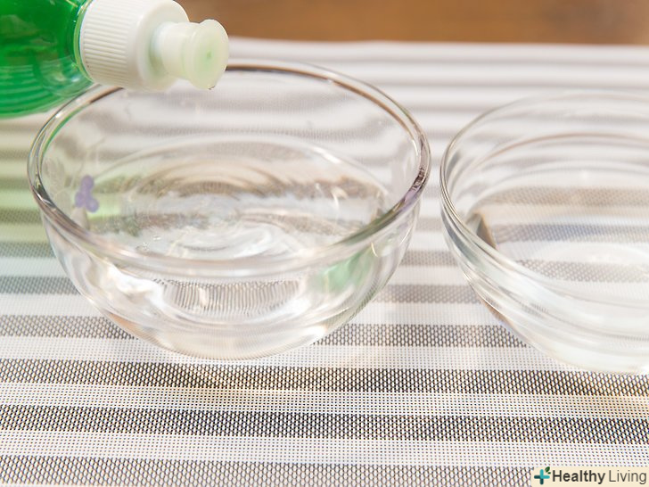 Додайте кілька крапель м'якого рідкого мила в одну з чаш. перемішайте мило з водою до повного розчинення, але піна при цьому не повинна утворитися. . [3]- Через брак рідкого мила для рук ви можете використовувати рідину для миття посуду або посудомийної машини. Не використовуйте такий засіб, в яке ви б не хотіли занурювати ваші руки.