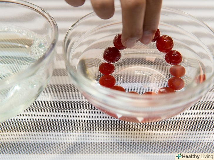 Опустіть бурштинове намисто в миску з мильною водою. акуратно пальцями видаліть бруд і наліт.- Скористайтеся м'якою зубною щіткою з метою видалення забруднень між намистинками. Просто тріть ці місця зубною щіткою до тих пір, поки не відчистите весь бруд. Злегка натискайте і не тріть занадто старанно, інакше ви можете подряпати Бурштин. [4]