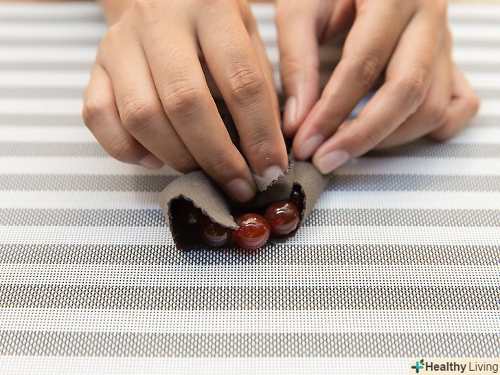 Поліруйте Бурштин темною стороною полірувальної тканини. тріть нею Бурштин швидкими круговими рухами. Робіть це до тих пір, поки бурштин не стане чистим і блискучим, і його мерехтіння не відновиться. [2]
