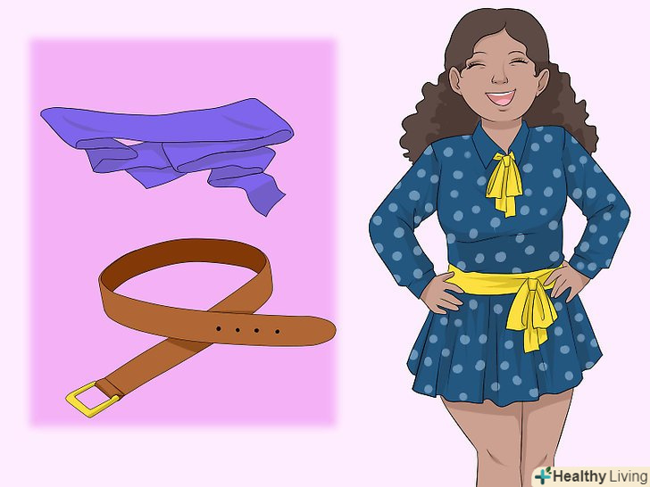 Одягніть ремінь або пояс. ремінь або пояс підкреслять вашу талію і розбавлять одноманітний візерунок. Поекспериментуйте, підбираючи відповідний ремінь. Виберіть оптимальний розмір пояса. Ви можете зупинити свій вибір на вузькому або широкому ремені. [10]
