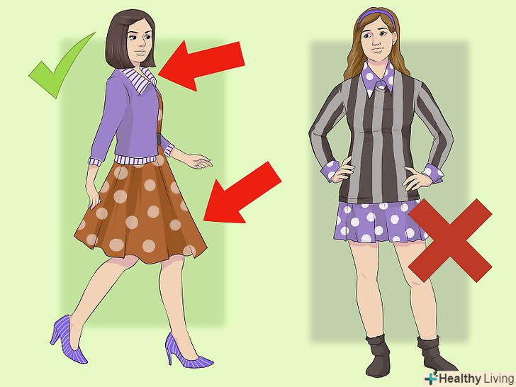 Поєднуйте візерунки правильно. неправильне поєднання візерунків може зробити наряд позбавленим смаку. Однак якщо ви хочете в своєму образі поєднувати кілька візерунків одночасно, подбайте про те, щоб один візерунок переважав над іншим. Наприклад, якщо ви носите светр в смужку, смуги на светрі повинні бути значно більше або менше в порівнянні з горошком на вашому платті. [3]- Замість візерунків можна підібрати яскраві аксесуари.