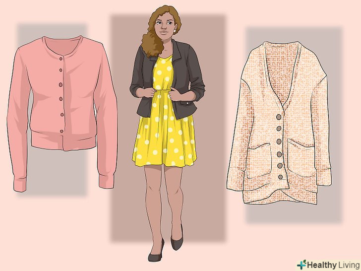 Одягніть светр або піджак. якщо ви віддаєте перевагу багатошаровість в одязі, надіньте, светр, піджак або куртку. Щільний кольоровий светр або піджак розбавлять однотонність сукні в горошок і забезпечать вас необхідним теплом. Взимку укорочений кашеміровий джемпер підкреслить вашу ніжність, а влітку чорний або джинсовий піджак значно поліпшить ваш образ. [6] ви також можете спробувати поєднувати плаття в горошок з кардиганом або блейзером.