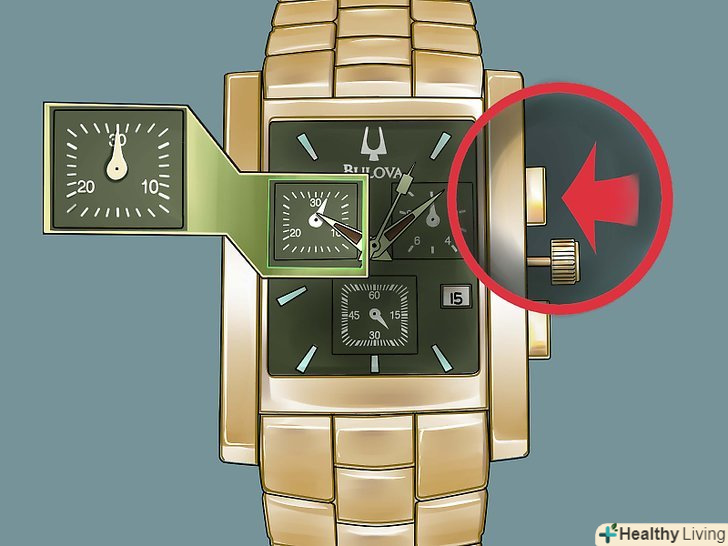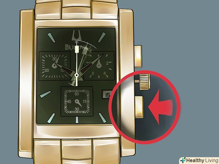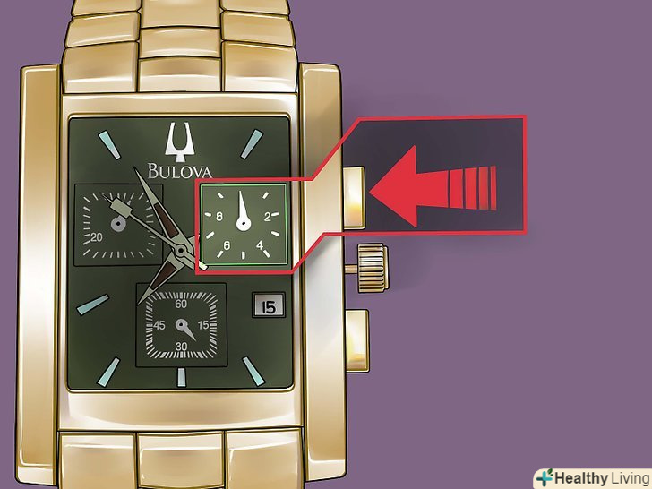 Натисніть на верхню кнопку. затисніть верхню кнопку, поки мілісекундна стрілка не перейде в позначку 0 годин на мілісекундному циферблаті.- Мілісекундний циферблат-це невеликий циферблат, який знаходиться над відміткою в 2 години.